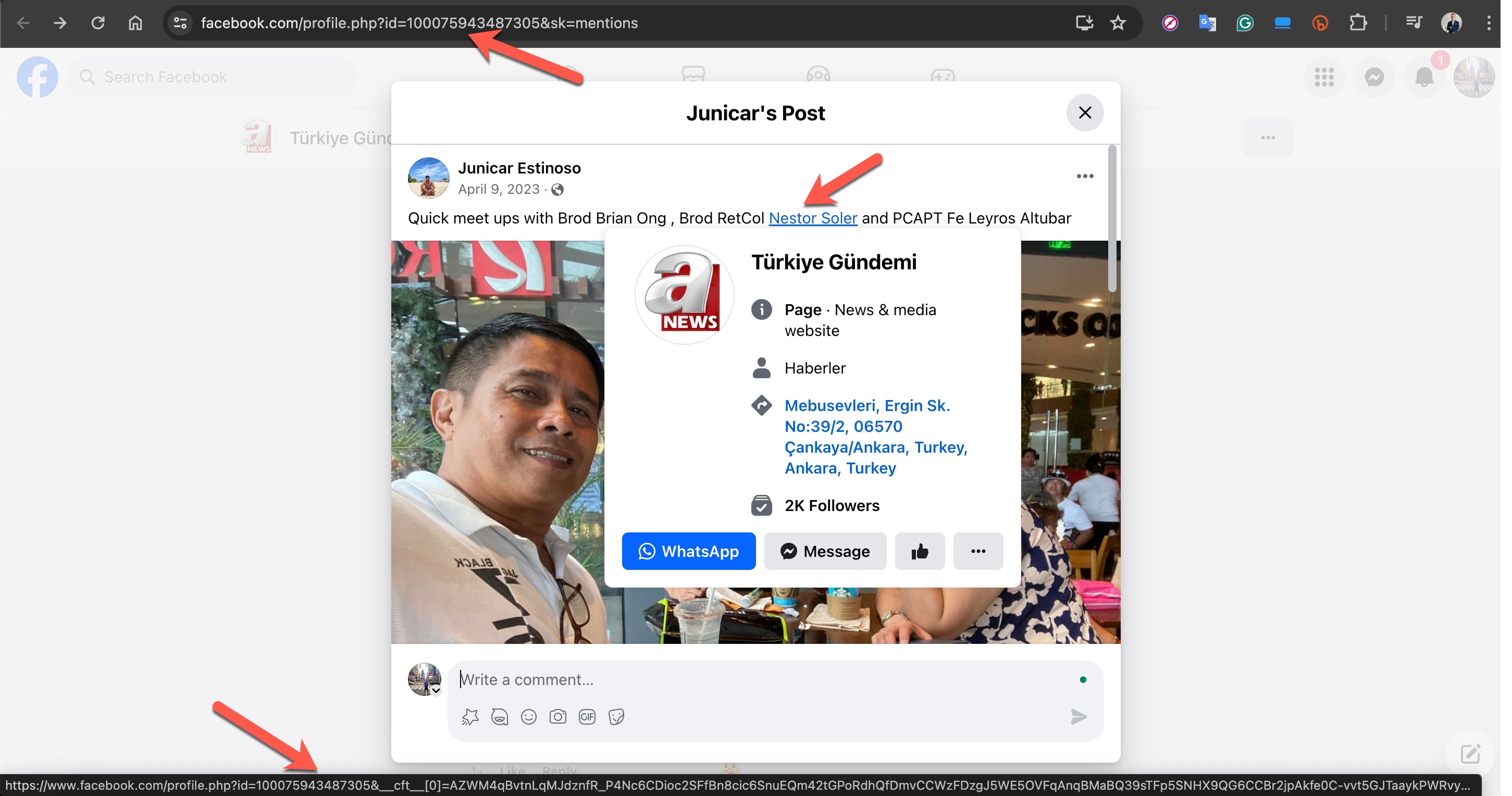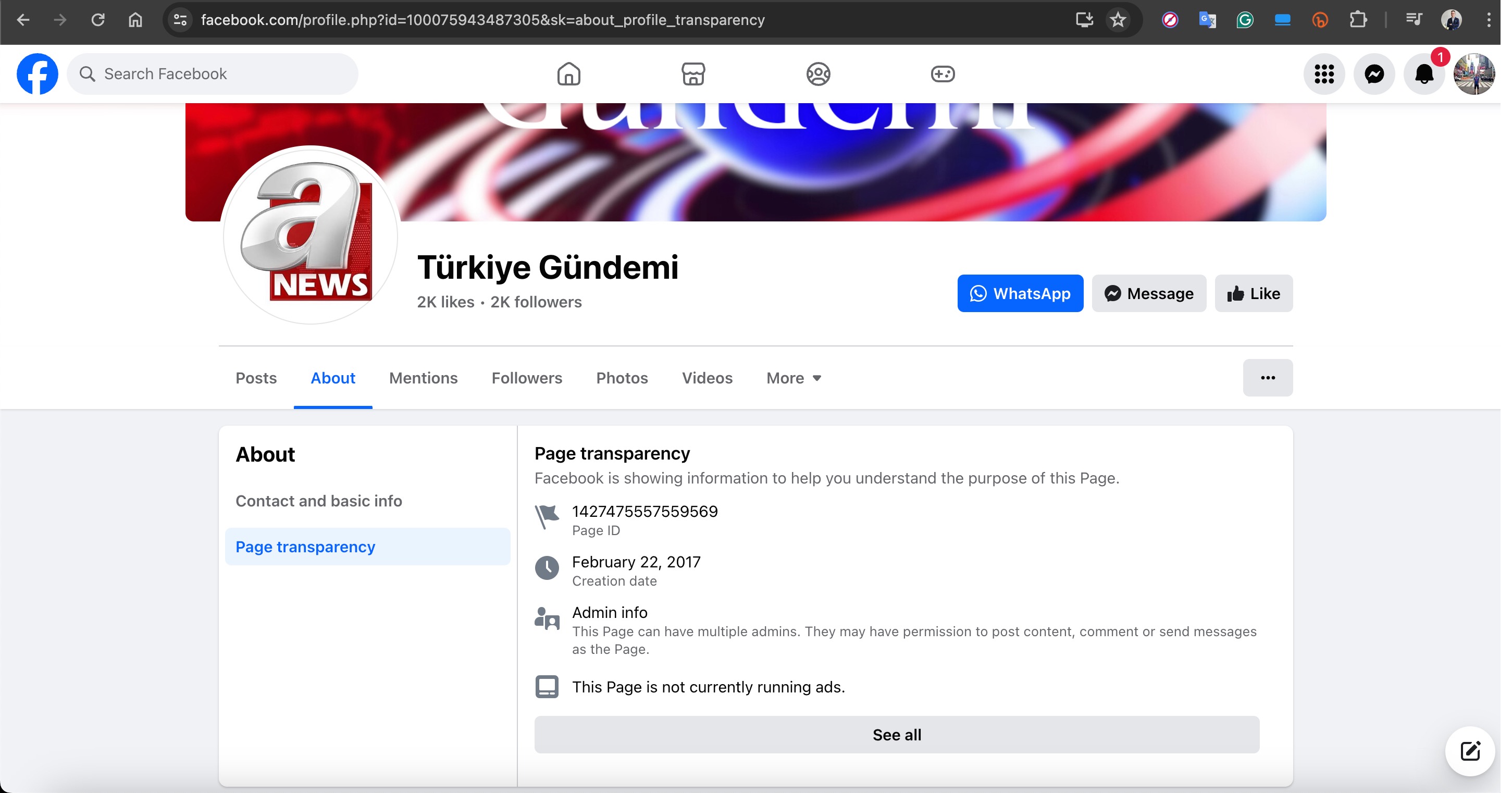 For example, the Facebook profile named “Türkiye Gündemi” in the screenshot below, which impersonated the A News channel, revealed upon inspecting the “Mentions” page that the account originally belonged to a person named Nestor Soler and had been created in 2017.