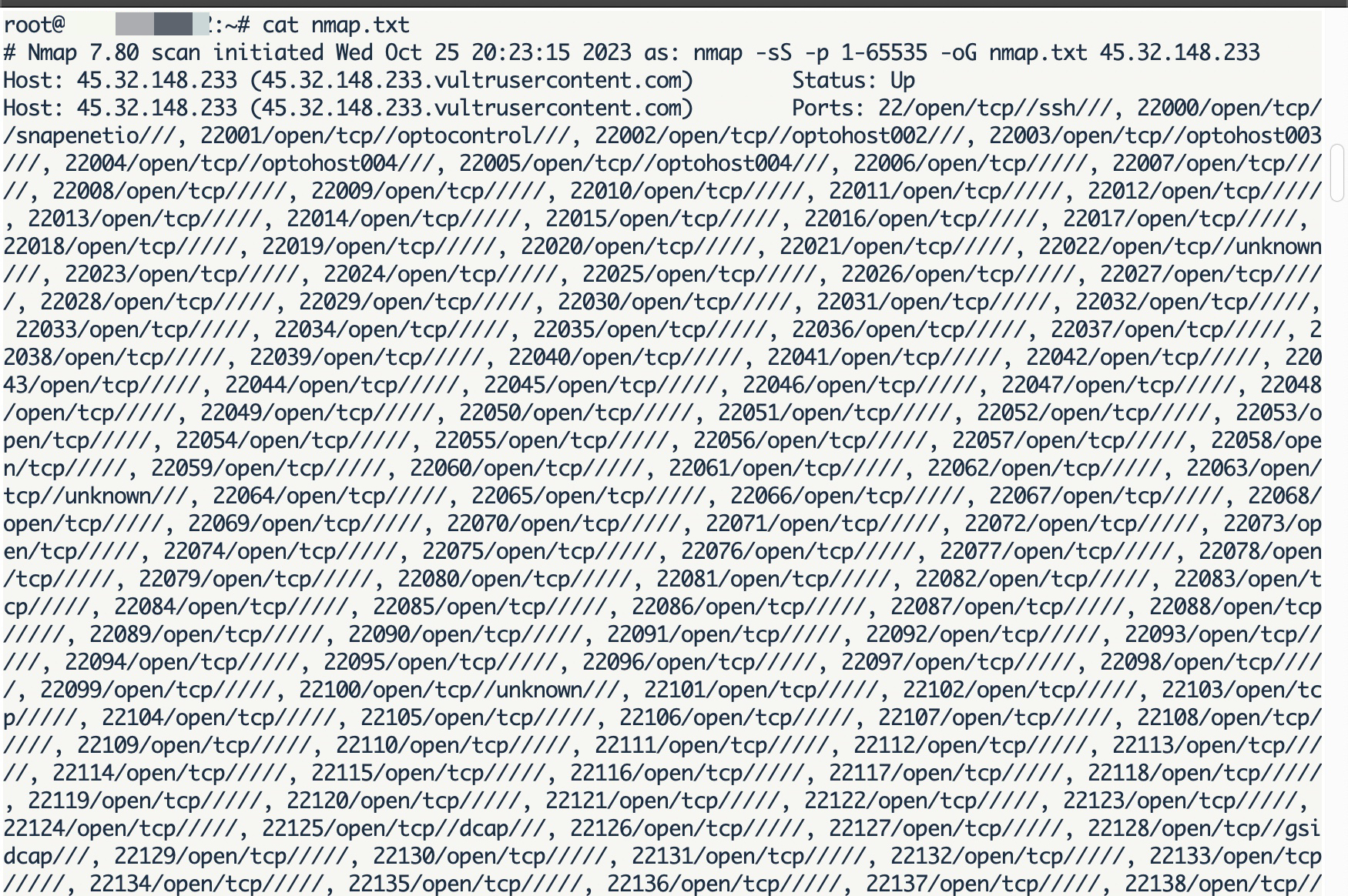 Censys isimli arama motorunda IPv4 adreslerini inceleyip, her birinin bağlantı noktalarını yine nmap aracı ile taradığımda bu defa IPv6 taramalarından farklı olarak her bir sunucuda 22. bağlantı noktası hariç 2000‘e yakın yeni bağlantı noktası olduğunu keşfettim.