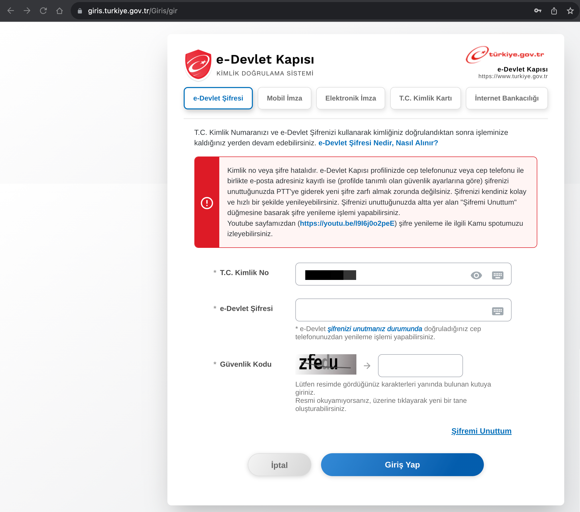 Peki TCKN bilgime sahip olan art niyetli bir kişi deneme yanılma / kaba kuvvet saldırısı (brute force) gerçekleştirerek er ya da geç parolamı tespit edip, iki aşamalı giriş aşamasına gelebilir miydi? Bu saldırı tekniğini engellemeye yönelik olarak e-Devlet Kapısı’nda CAPTCHA veya IP adresi engelleme gibi bir dizi güvenlik önlemi yok muydu? sorularına yanıt bulmak için öncelikle hatalı parolalar ile e-Devlet hesabıma giriş yapmaya çalıştım. İki hatalı giriş denemesinden sonra güvenli bir web uygulamasında olması gerektiği gibi karşıma CAPTCHA kontrolü çıktı ve hesabım kullanıma kapatılmadı. O halde saldırgan hesabımı nasıl geçici süreliğine kullanıma kapatmayı başarmıştı?
