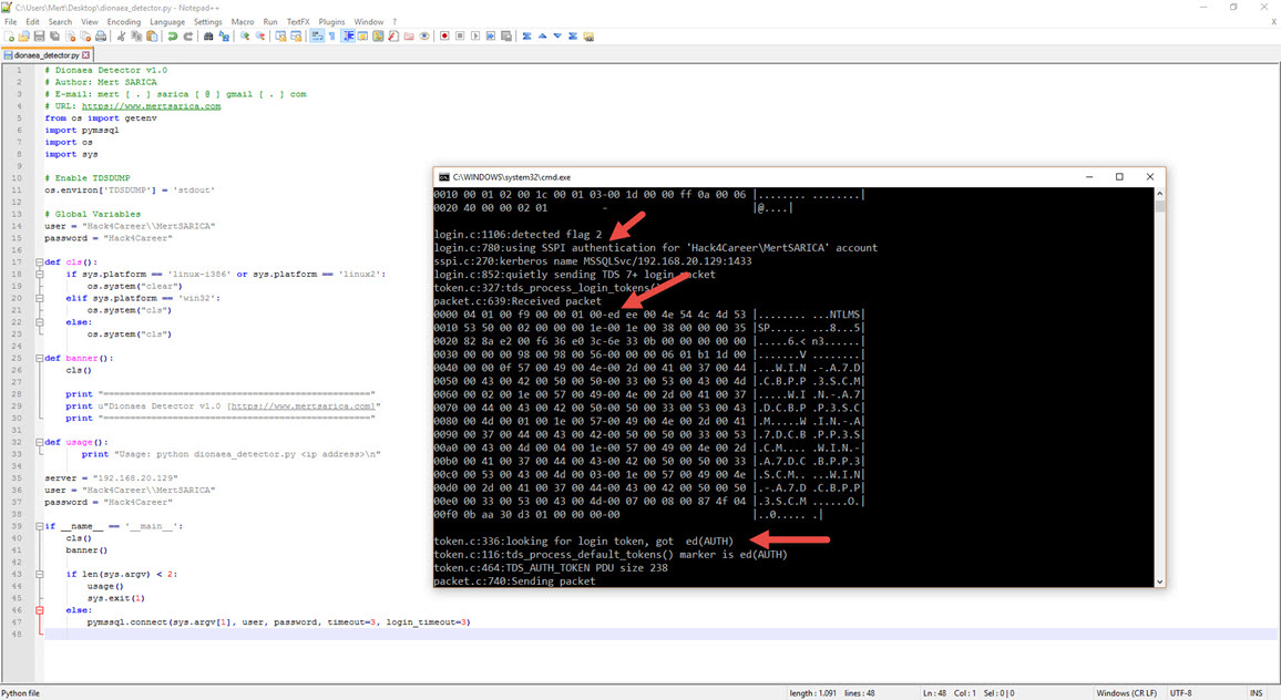To establish communication between an MSSQL server and a client at the application level, the TDS (Tabular Data Stream) protocol must be used. The TDS protocol supports two types of login methods that have been available since the beginning. The first is login using a username and password, and the second is login using Windows authentication (NTLM). Normally, when attempting to log in with a username and password using the TDS protocol, the response from the MSSQL server should include the LOGINACK_TOKEN (0xAD) token, and when attempting to log in with Windows authentication, it should include the SSPI TOKEN (0xED) token. However, Dionaea returns the same result for both types of requests. :)