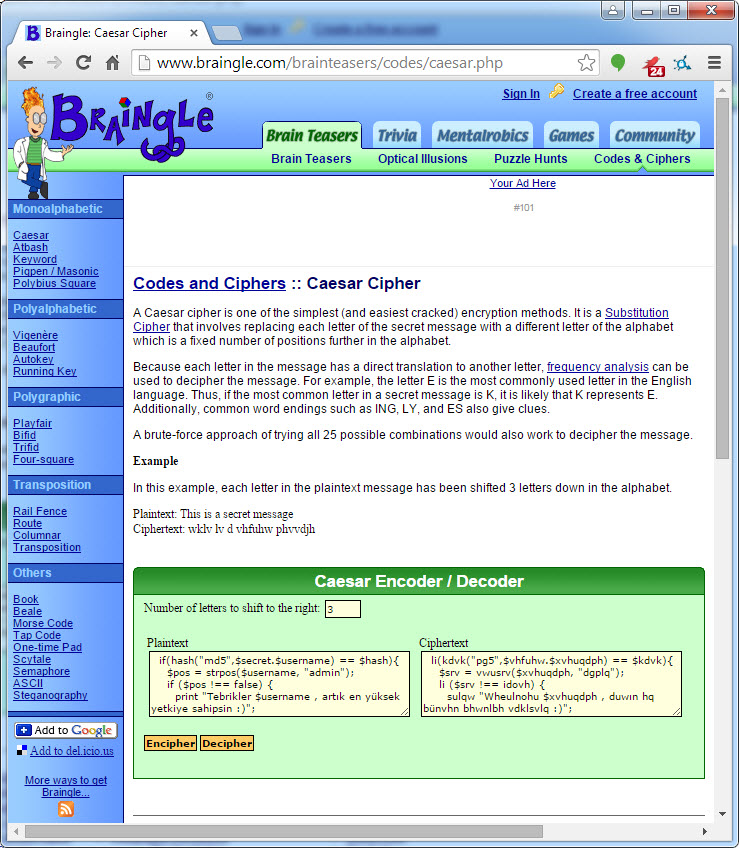 (Sen de mi Brütüs) cümlesinden bunun Sezar‘a ait bir söz olduğundan yola çıkarak gizlenmiş mesajın Sezar’ın Şifrelemesi ile oluşturulduğunu (ROT-3 kullanılmıştır) tahmin edebilirdiniz. Çözmek için ise Google’dan faydalanabilirdiniz.
